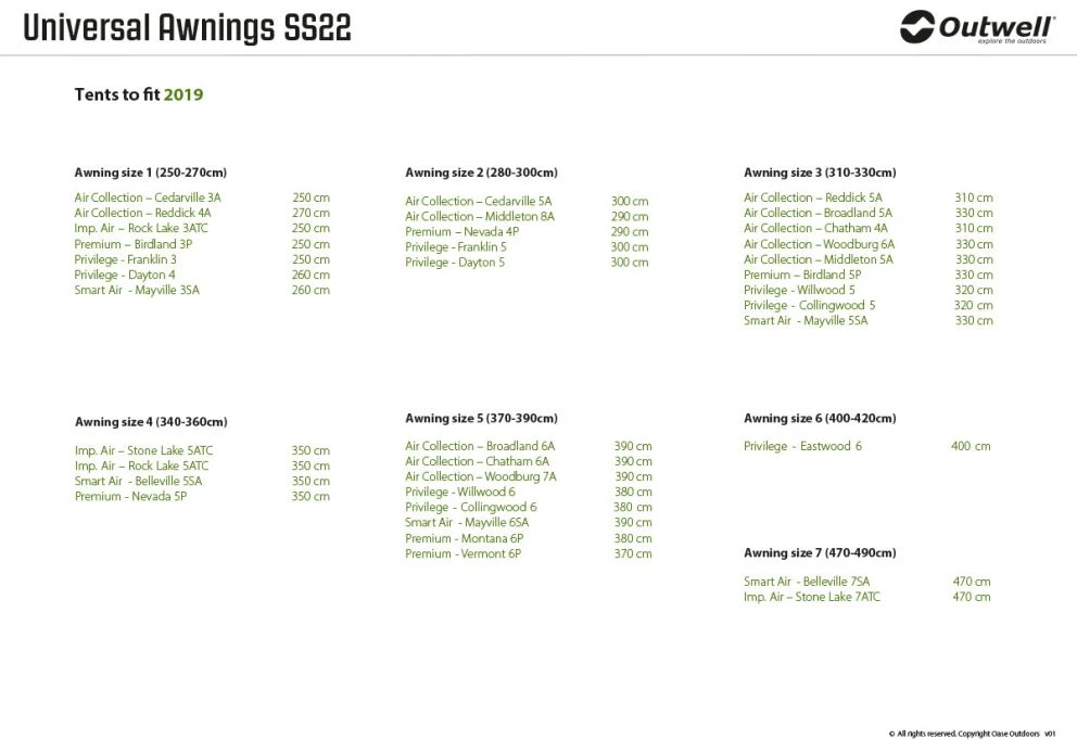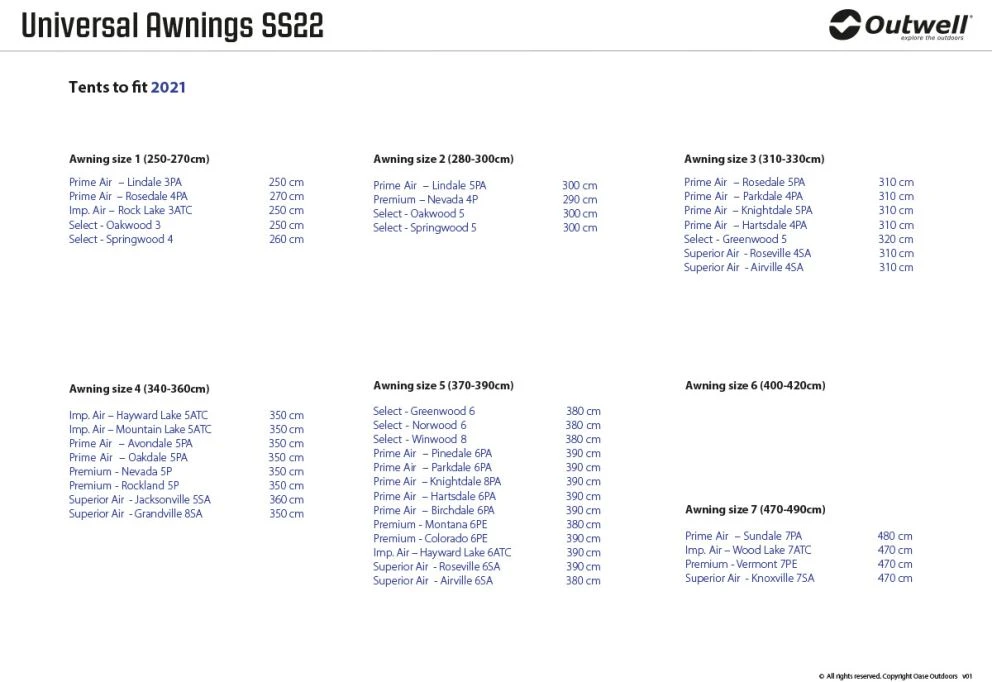 Designed to fit all Outwell inflatable and poled tents (except Encounter tents), you can easily extend yours with an Outwell Universal Awning. As superbly engineered and carefully crafted designs, each is easy to attach so you can quickly add sheltered space to your living area for relaxing or to use it as storage. With steel poles and Outtex® 4000 Select fabric, the sturdy design is stable and durable whilst for practical access via the sloping front door, each has a fold-flat groundsheet.