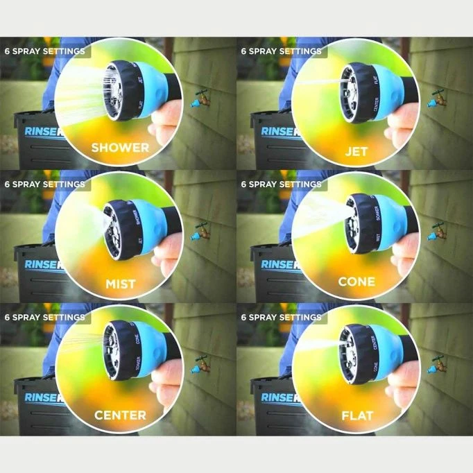 The RinseKit hose quickly attaches to your tap with a quick connector. When the water is turned on, it fills the 1.75-gallon eon pressure chamber with approximately 65psi of water pressure (standard home pressure) in 20 seconds time. The water is then stored in the chamber and can hold pressure for up to one month. when it’s time to clean up, simply attach the spray nozzle to the RinseKit hose with the quick coupler, select one of the 6 spray settings and fire away! This patented design has no moving parts and can be filled with hot or cold water an infinite number of times. Simple, versatile and durable, the patented RinseKit is perfect for any cleanup on the go.
