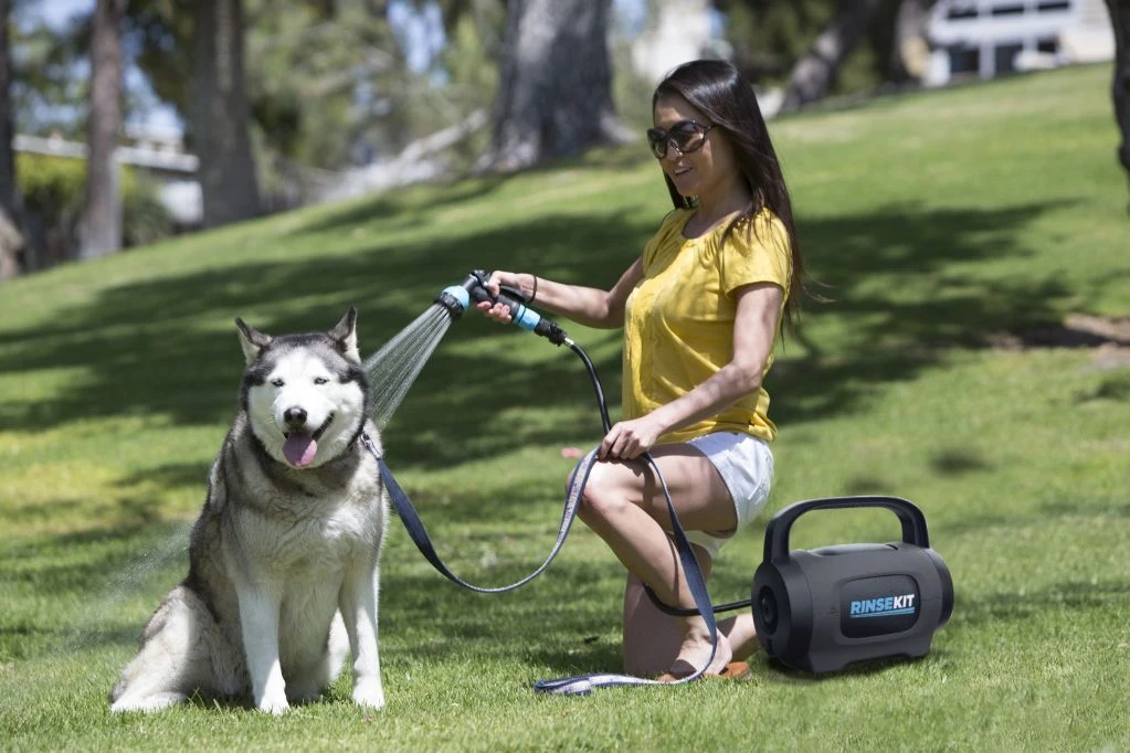 With no pumping and no batteries, RinseKit POD delivers a pressurized spray for up to three and a half minutes. RinseKit stores the strength of a regular household spigot or sink (with an adapter) and can be quickly filled with hot or cold water.