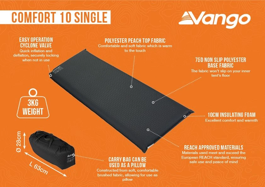Designed with a stylish, soft-touch flocked finish top and durable non-slip base, the luxurious Vango Comfort 10cm Single self-inflating sleeping mat offers unrivalled comfort and convenience.